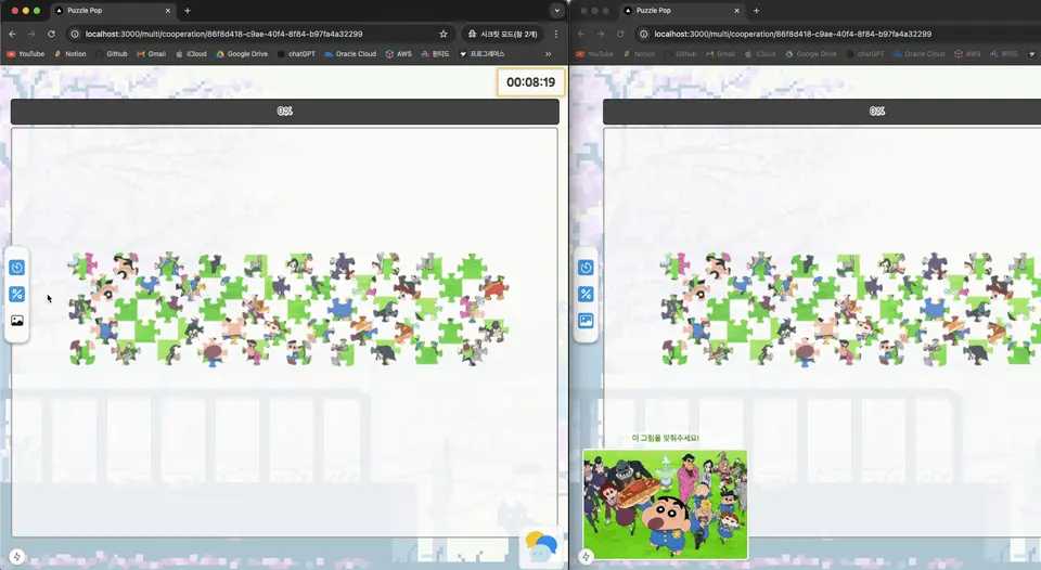 1. 타이머, 가이드그림, 퍼센티지바를 끌 수 있어요. (아이패드 미니의 경우, 화면 크기가 캔버스 크기와 거의 비슷해서 유저편의성을 위해 구현했어요)2. 다른 유저들과 함께 퍼즐을 맞출 수 있어요.3. 일정시간 안에 빠르게 퍼즐을 맞추면 콤보 효과가 발동되요.